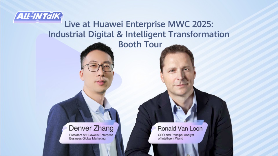 Can't visit Huawei MWC booth? Explore innovative ICT solutions empowering industries at our 1,200㎡ exhibit. Join Zhang Jianjun, President of Huawei's Enterprise Business Global Marketing and Ronald van Loon, Intelligent World CEO, for industry scenarios and smart technologies.