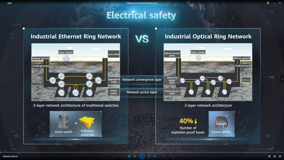 Based on Industrial Optical Ring (IOR) technology, Huawei FTTM solution replaces active network devices with passive ones. Mining production safety is improved across the board, as the industry becomes less labor-intensive. Intelligence allows certain tasks to be performed unattended.