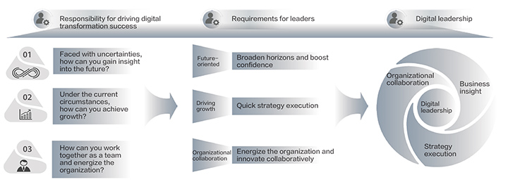 Step 2: By breaking down leaders' responsibilities during digital transformation, Huawei has developed a digital leadership model from three perspectives: future-oriented approaches, driving growth, and energizing the whole organization. (See Figure 1)