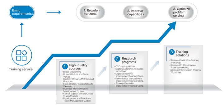 In the digital transformation process, requirements for executive leadership improvement are divided into three levels: broadening horizons and changing mindsets, improving capabilities, and optimizing problem solving. Huawei's digital leadership training model (see Figure 2) is also divided into three levels: high-quality courses based on practice sharing, research programs based on key groups, and training practice solutions based on business issues. Based on the fundamental requirements of enterprises, Huawei aims to help enterprises succeed through customized design and training.