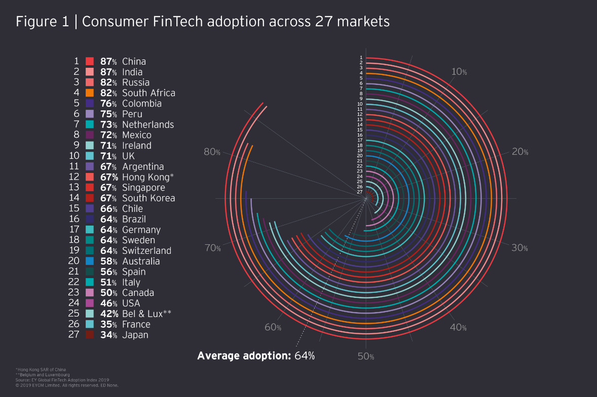 Immediately what stood out to me was that this was a very Westernized view of Fintech. In China, according to research by both EY and Statista, fintech adoption rates peaked at 87 percent of the population in 2019 and were as high as 92 percent for certain segments of the market. Whereas, the UK trailed at 71 percent of the population and the USA didn't even reach the 50 percent mark. While consumer fintech adoption is just one measure, it's very clear that fintech has affected far more citizens day-to-day in China and India than it has in the United States or the broader UK outside of London. Lack of regulatory flexibility and incumbent lobbying of government administration has worked effectively in the US at slowing down consumer-level adoption in respect to fintech modality and brands. In the US it is a fight to disrupt, in China the disruption is embraced.