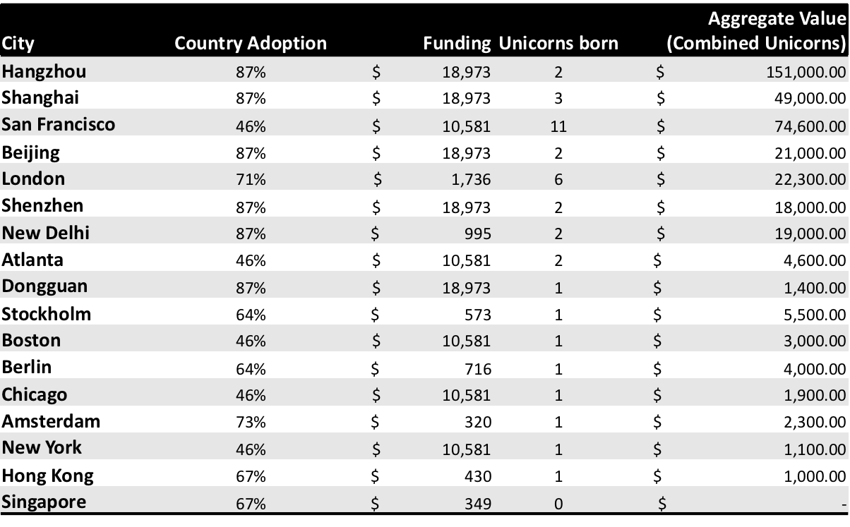 By comparing citizen adoption, the number of unicorns produced and their aggregate value, along with overall fintech funding by VCs we get a very different picture of both the US (Crunchbase) and China (Cambridge) studies, as you'd expect. Interestingly enough, New York, Hong Kong and Singapore all fare rather poorly, in fact, Atlanta beats out NYC in pure Unicorn producing power. I'm sure that this will create some lively debate, but these are simple rankings based on an aggregate of primary factors. We certainly could add more data points, such as the number of people employed by city in Fintech, if we could get those data points.