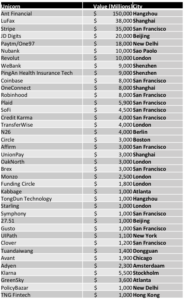For level setting, the largest privately owned company in the world is Ant Financial worth $150 Billion at the last valuation, and of the top 10 privately owned unicorns globally, 5 live in the US and 5 in China (based on 2018/2019 figures).