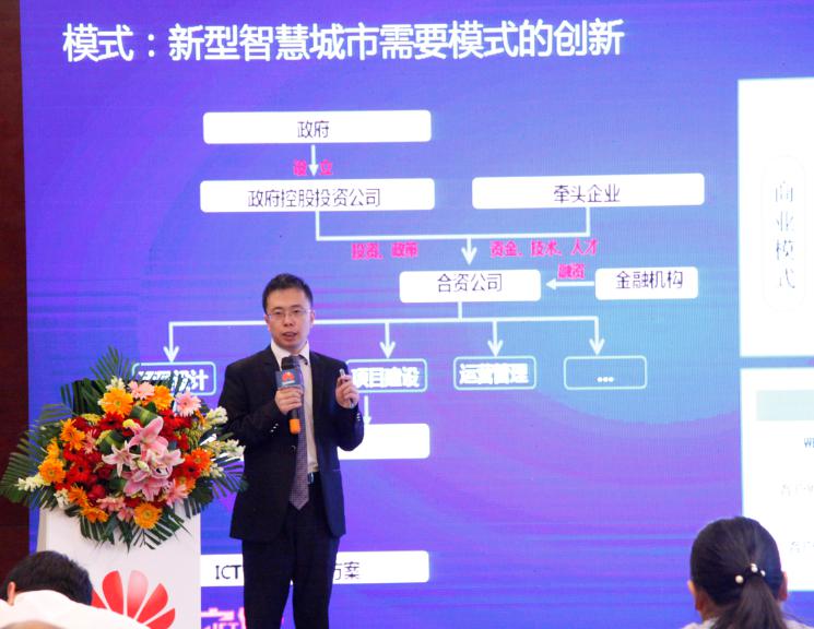 随后,华为贵阳企业业务部产品与解决方案部长胡海峰带来了“新ICT 开启智慧城市美好未来”主题演讲。胡海峰介绍到,建设新型智慧城市面临顶层设计、模式、生态、平台和大数据这五个方面的挑战。华为在智慧城市的定位就是致力于成为新型智慧城市解决方案的首选合作伙伴,聚焦在ICT的基础设施平台,通过开放能力去聚合合作伙伴,推动智慧城市生态圈的良性发展,共同为客户提供新型智慧城市的整体解决方案。在这个领域,华为有智慧城市的专家团,是中国智慧城市专家组的成员单位,参与国家智慧城市标准化的制定工作;并且有着业界最完整的产品线和产品开发架构;同时华为有丰富的智慧城市建设经验,在2016年中标了42个智慧城市项目,与62个城市签署了战略合作;此外,华为有1100家的平台解决伙伴和5000家以上销售服务伙伴,将共同为智慧城市建设提供方案与服务。
