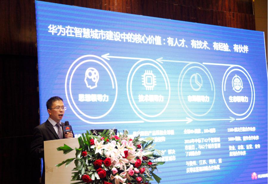 随后,华为贵阳企业业务部产品与解决方案部长胡海峰带来了“新ICT 开启智慧城市美好未来”主题演讲。胡海峰介绍到,建设新型智慧城市面临顶层设计、模式、生态、平台和大数据这五个方面的挑战。华为在智慧城市的定位就是致力于成为新型智慧城市解决方案的首选合作伙伴,聚焦在ICT的基础设施平台,通过开放能力去聚合合作伙伴,推动智慧城市生态圈的良性发展,共同为客户提供新型智慧城市的整体解决方案。在这个领域,华为有智慧城市的专家团,是中国智慧城市专家组的成员单位,参与国家智慧城市标准化的制定工作;并且有着业界最完整的产品线和产品开发架构;同时华为有丰富的智慧城市建设经验,在2016年中标了42个智慧城市项目,与62个城市签署了战略合作;此外,华为有1100家的平台解决伙伴和5000家以上销售服务伙伴,将共同为智慧城市建设提供方案与服务。